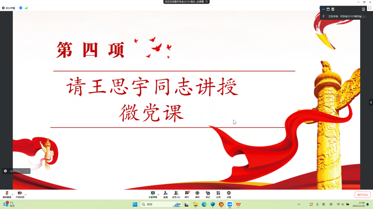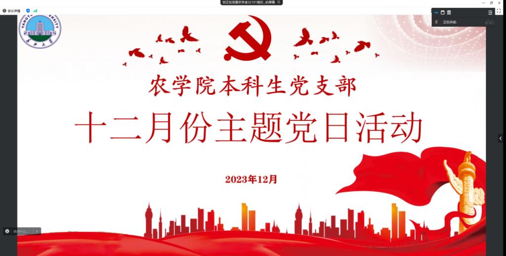 (通讯员 徐志鹏)12月29日晚上17:00,我院本科生党支部在腾讯会议开展十二月主题党日活动,支部党员应到44人,实到44人,本次活动由支部党员姜月兴同志主持。