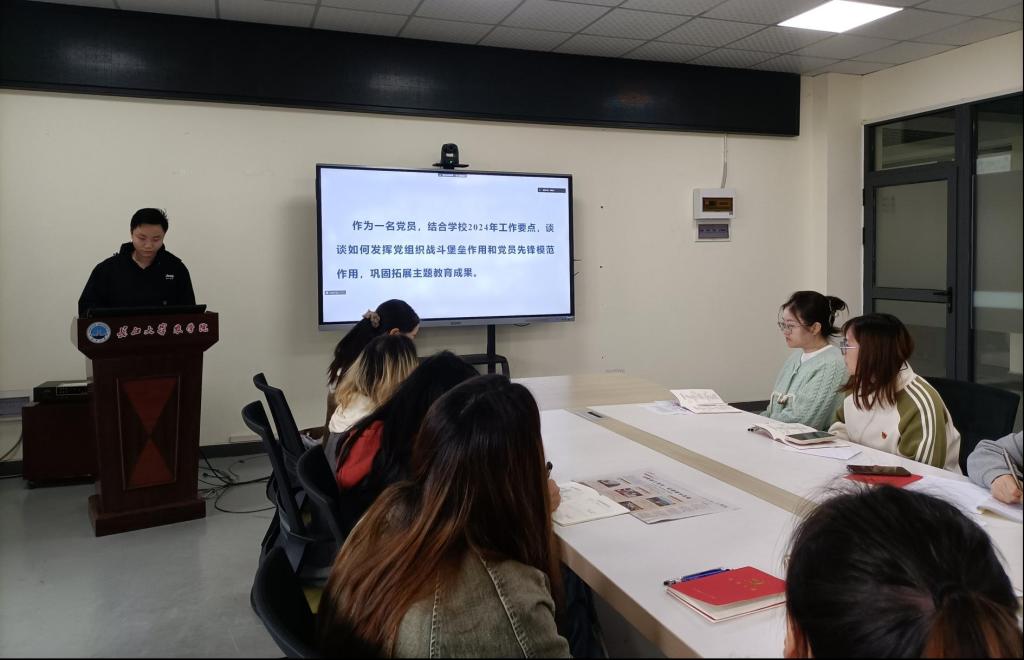 接着,全体党员以“作为一名党员,结合学校2024年工作要点,谈谈如何发挥党组织战斗堡垒作用和党员先锋模范作用,巩固拓展主题教育成果”为主题展开研讨,宋梦圆同志认为要激励广大党员充分发挥宣传党的主张、贯彻党的决定,进一步发挥党员先锋模范作用,教育引导广大党员践行初心使命,提倡戴党员徽章、亮党员身份、当先锋模范,引导党员结合自身实际参与志愿服务活动。