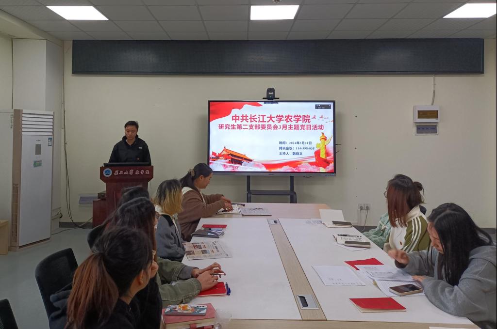 (通讯员 宋梦圆)2024年3月21日,我院研究生第二党支部在农科大楼3071开展三月份主题党日活动,活动结合腾讯会议(ID:114 598 035)的方式同时在线上召开。全体在校党员和校外联培党员共同参与,活动由韩晓文同志主持。