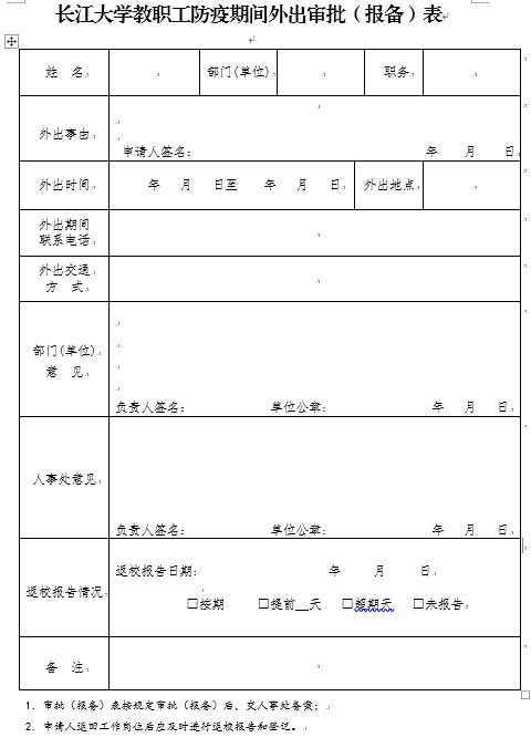 77779193永利官网教职工防疫期间外出审批(报备)表