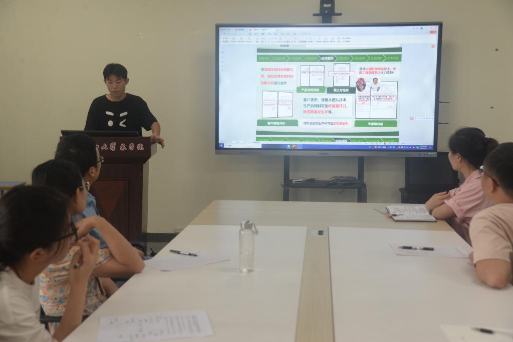 项目一团队介绍了他们的甘氨酸甜菜碱在农业中的应用研究项目,该项目旨在集数据之大成,解甜菜碱之隐忧,项目负责人以ppt汇报的形式从项目概述、应用领域、研究现状、实验数据、应用效果等方面进行汇报,在ppt演讲结束后,老师们从ppt展示逻辑、调研数据应用、创新点凸显等方面对参赛作品提出了详细修改建议。